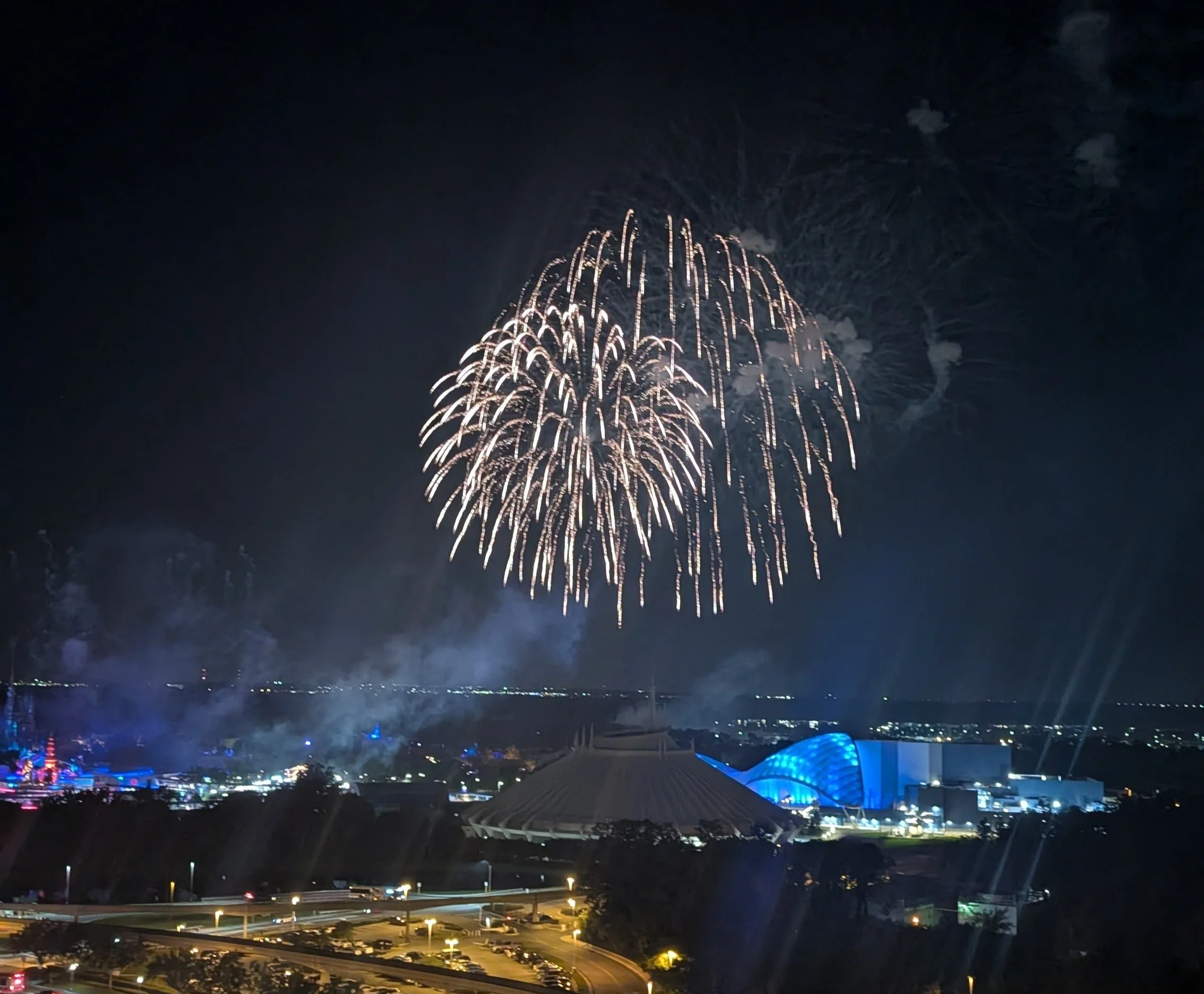 So speaking of the fireworks, this event is basically a dinner and a private deck to watch the fireworks from. However, we noticed that around 8:40 a number of groups who were not with the event went out onto the roof deck that was supposed to be reserved for just us. I assumed that close to the fireworks a cast member would go out there to move those people, but nope, nobody was monitoring who was going out there. We went out at 9:10 and were the first people from the event to go out (easy to see since we all had bright green wristbands), and all the spots along the far edge facing Seven Seas Lagoon were already taken by the people who didn’t pay for the event. This is something I do believe Disney should remedy since they clearly state on the event description that the viewing deck is private and only for those at the event. Fortunately, we recognized that the better view of the show would be on the end facing Bay Lake Tower rather than Seven Seas Lagoon, so we grabbed our spot there and had a perfect view of the fireworks.