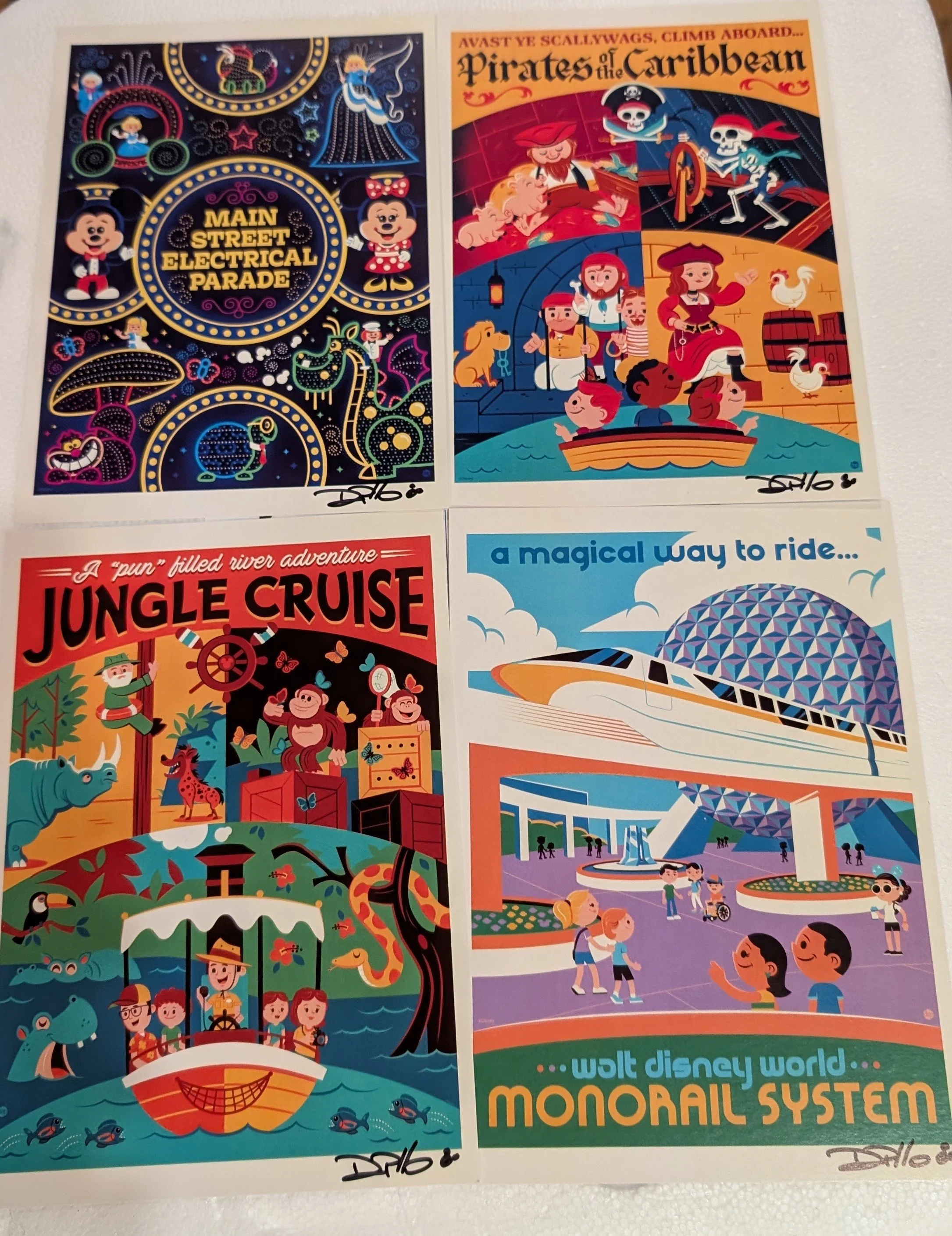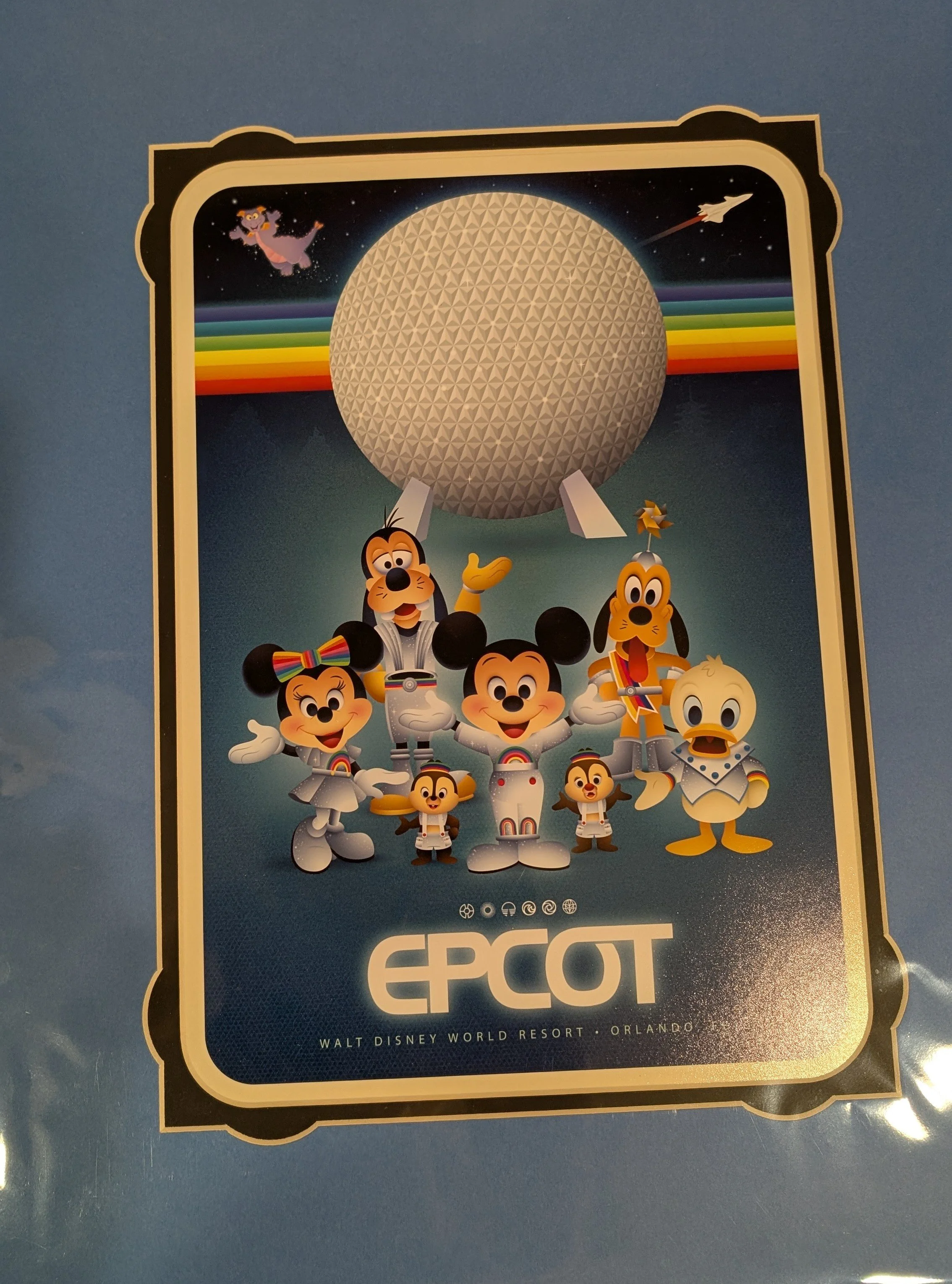 After the ride we decided to browse some of the art booths. I ended up getting a large print of the festival poster with the characters in the 1980s costumes in front of SE, I also got some smaller prints as well, one of the Orange Bird, one with Remy, and a set of postcards of prints I loved but couldn’t justify buying all four of the large prints, they were the ones with the monorail in Epcot, Pirates, Jungle Cruise, and the Main Street Electrical Parade. And bonus, the artist was there that evening and signed them for me!